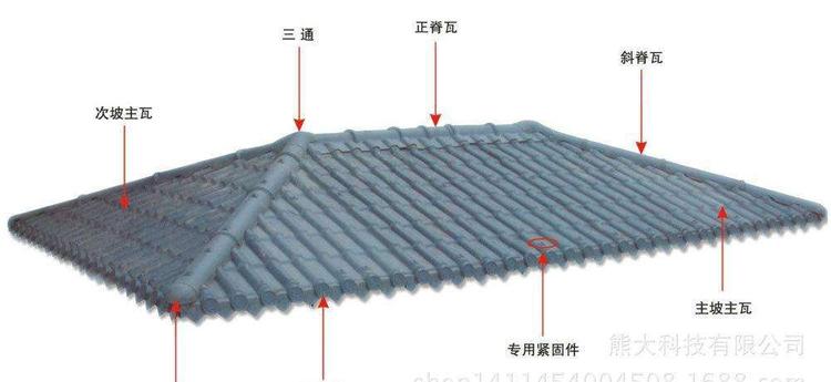 合成树脂瓦,是运用高新化学化工技术研制而成的新型建筑材料,具有重量轻、强度大、防水防潮、防腐阻燃、隔音隔热等多种优良特性,普遍适用于开发区平改坡、农贸市场、商场、住宅小区、新农村建设居民高档别墅、雨篷、遮阳篷、仿古建筑等。合成树脂瓦规格为1050mm-960mm-880毫米-800mm