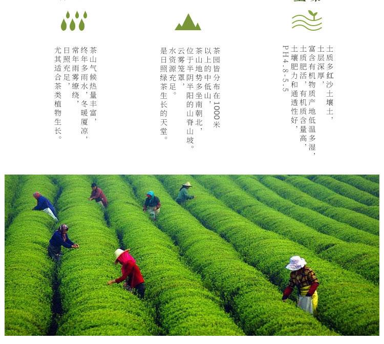 茶叶特点:条索紧细、圆直、微露白毫,色泽苍翠润绿,形如松针,茶汤清澈明亮、香气清鲜、滋味醇爽
