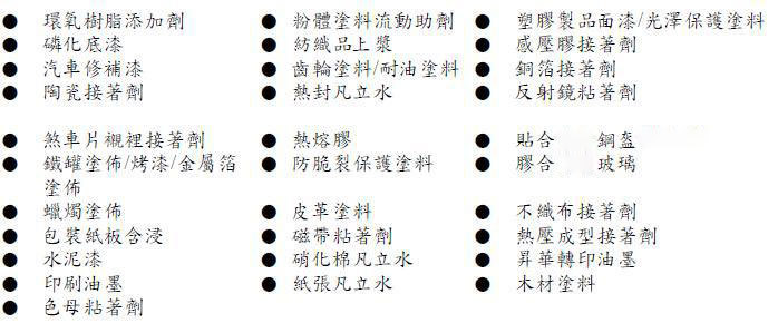 用途 油墨,墨水,电子材料,陶瓷基板,汽车涂料等30个用途