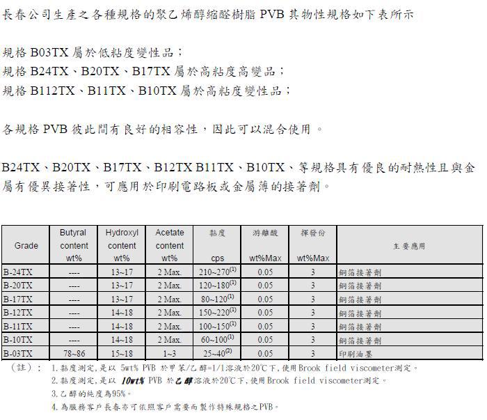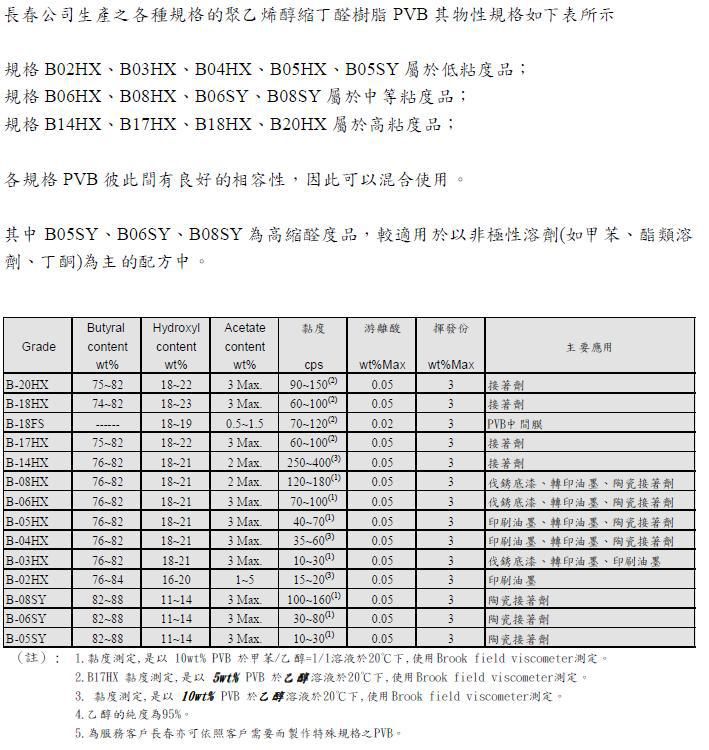 聚乙烯醇縮丁醛樹脂(Polyvinyl Butyral Resin 簡稱PVB )是由聚乙烯醇 (簡稱PVA) 與丁醛於酸觸媒作用下進行縮醛反應所合成的一種溶劑型樹脂。PVB 具有良好的造膜性,PVB 形成的塗膜具有高透明性、彈性、韌性、耐強鹼、耐油性、可撓性、耐候性與低溫耐衝擊性等優越的特性,而且PVB 具有特殊的化學結構,所以對玻璃、金屬、陶瓷粉、塑膠、皮革及木材等都有優良的接著性;此外對顏料與染料有良好的分散性,與多種 樹脂也具有不錯的相容性。