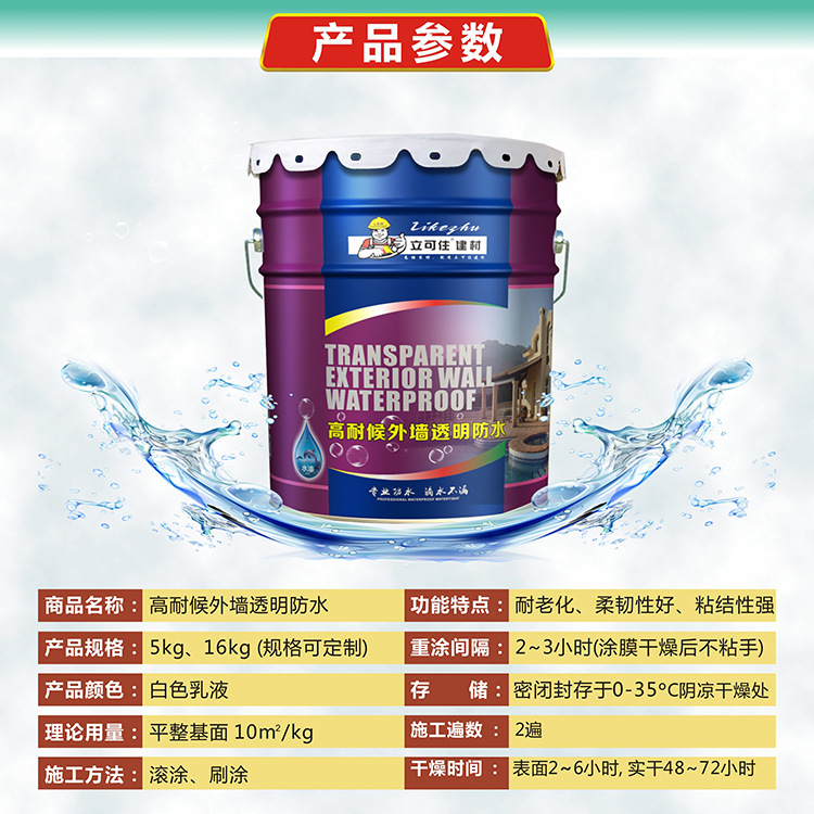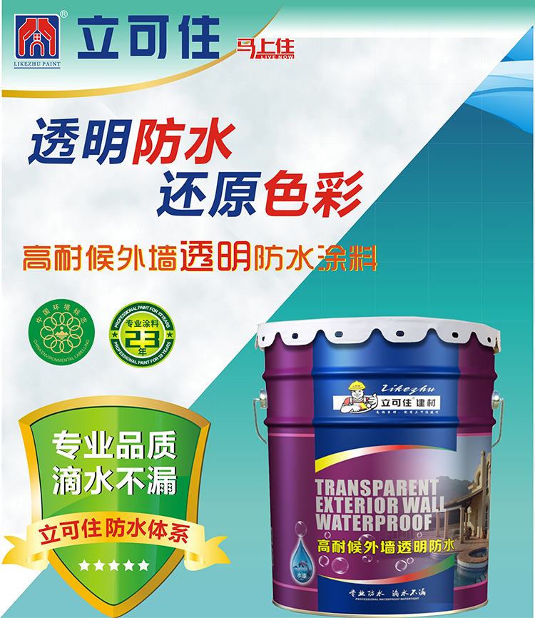 立可住透明防水胶 外墙透明防水涂料 是采用环保材料为基材 添加多种助剂及填充料经现代高新技术精细加工而成 高性能的绿色环保防水涂料 具有阻隔雨水渗透墙壁 杭老化等特点欢迎订购