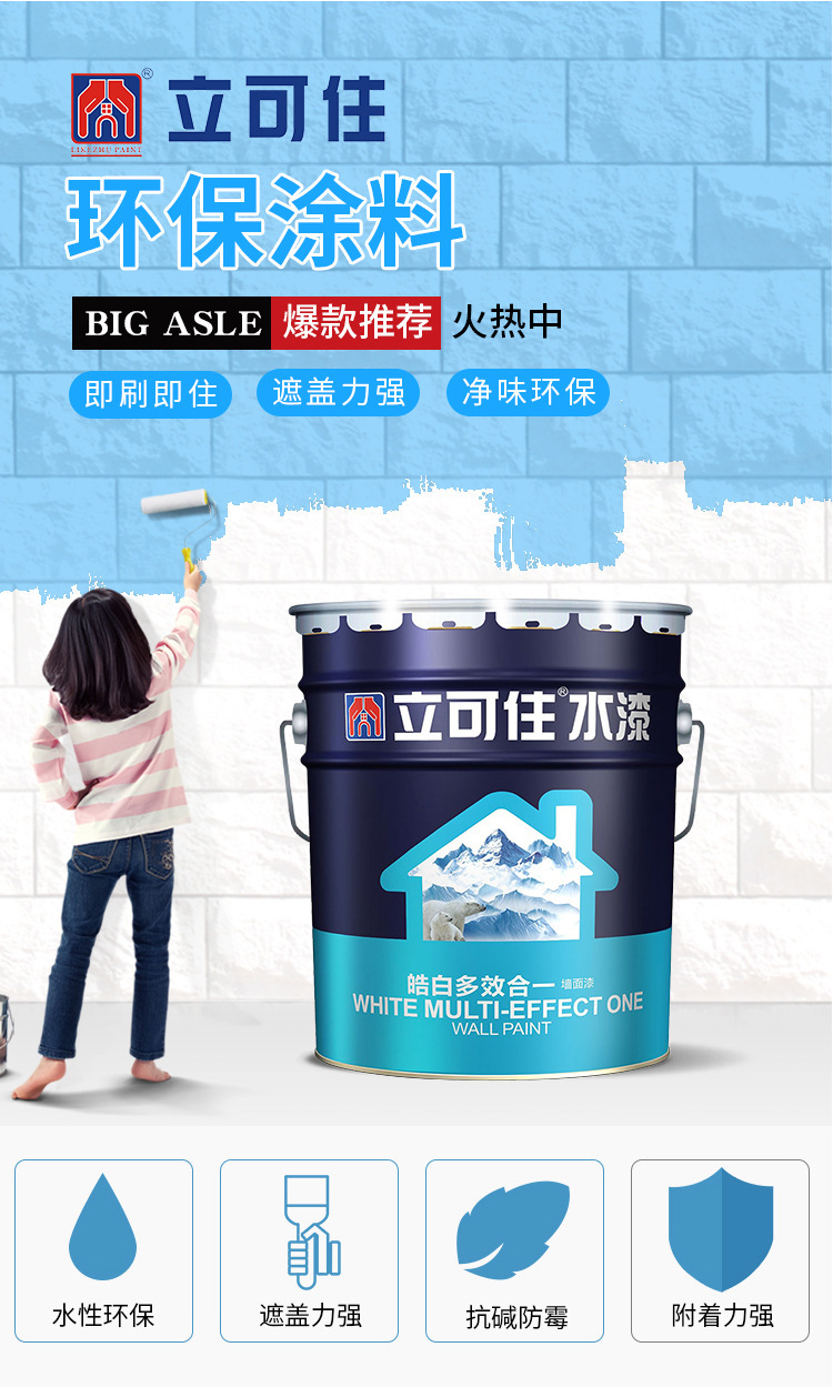 立可住乳胶漆 内墙乳胶漆 水性墙面漆 白色室内环保防霉涂料 水性环保 附着力好 遮盖力强 稳定色泽无暇 具有杭碱防霉 长期阻止水分渗透及霉菌滋生等特点 现货供应 欢迎订购