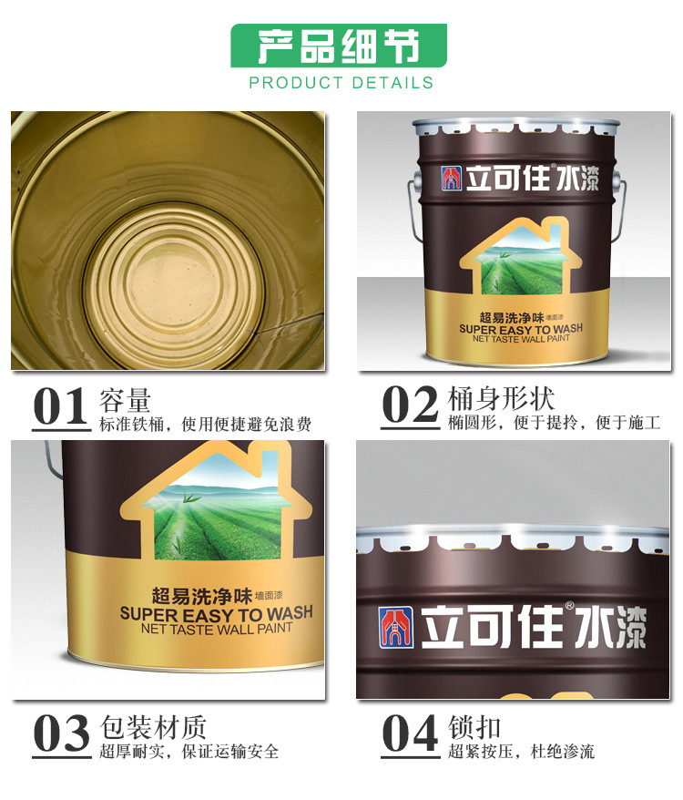 特色服务 : | 厂家负责施工技术指导 | 超易洗环保墙面内墙漆 : | 立可住超易洗环保墙面漆 内墙墙面漆 |