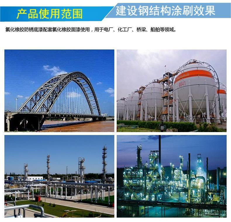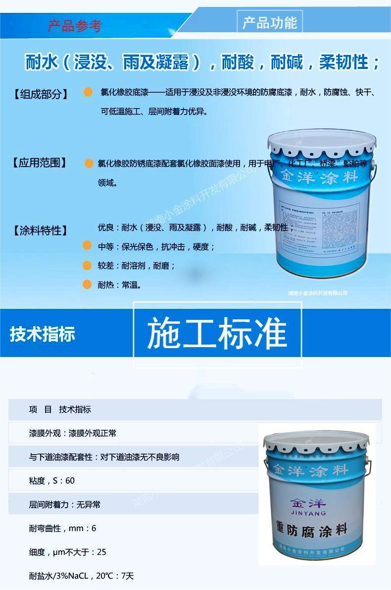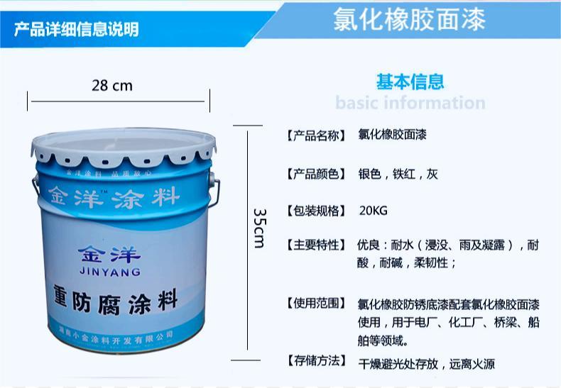 金洋牌 氯化橡胶面漆 防腐面漆 适用于 浸设及非浸设环境防腐漆 氯化橡胶底漆与氯化橡胶面漆使用 具有耐酸 耐碱耐水 防腐等优点 适用范围 电厂 化工厂 桥梁 船舶等
