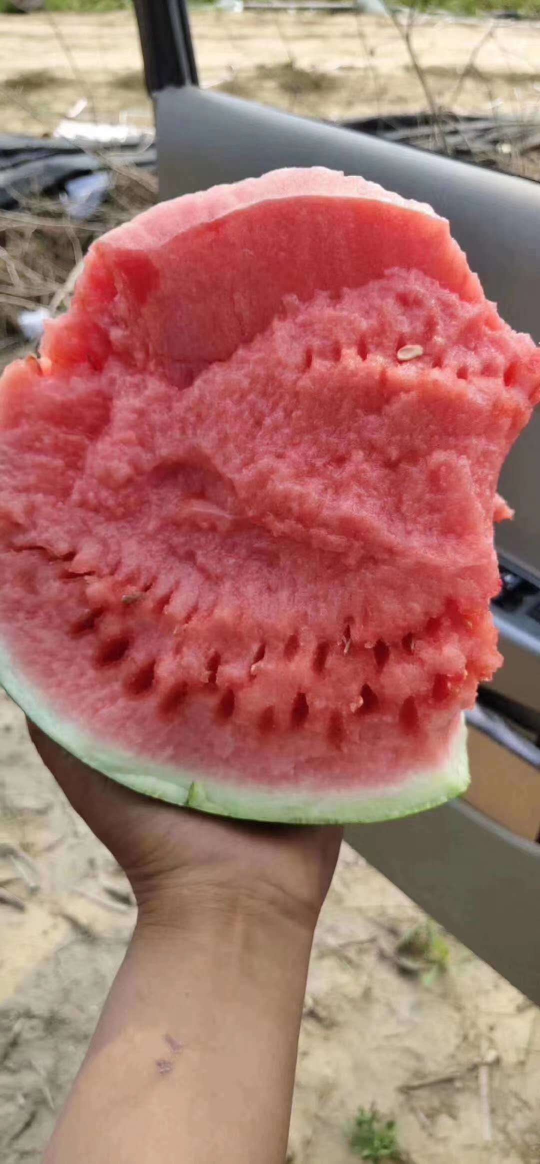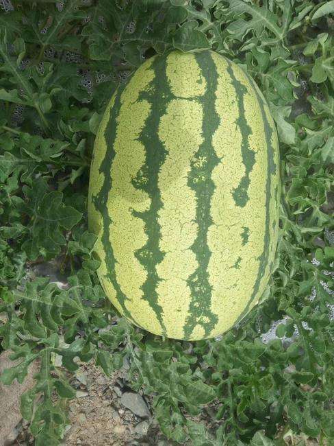 品种主要性状:该品种属中早熟,开花至成熟35天左右;花皮、长稍圆,淡绿底,深绿条带,大红瓢、肉质脆、细嫩、汁多、风味佳、中心糖度13以上,皮韧、抗压、耐运输。抗性好,植株长势旺盛;单瓜重12公斤左右, 25公斤左右。品质优越,市场认可度高,是瓜农增产、增收的好品种。