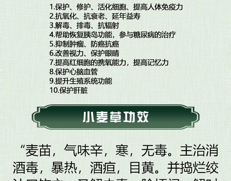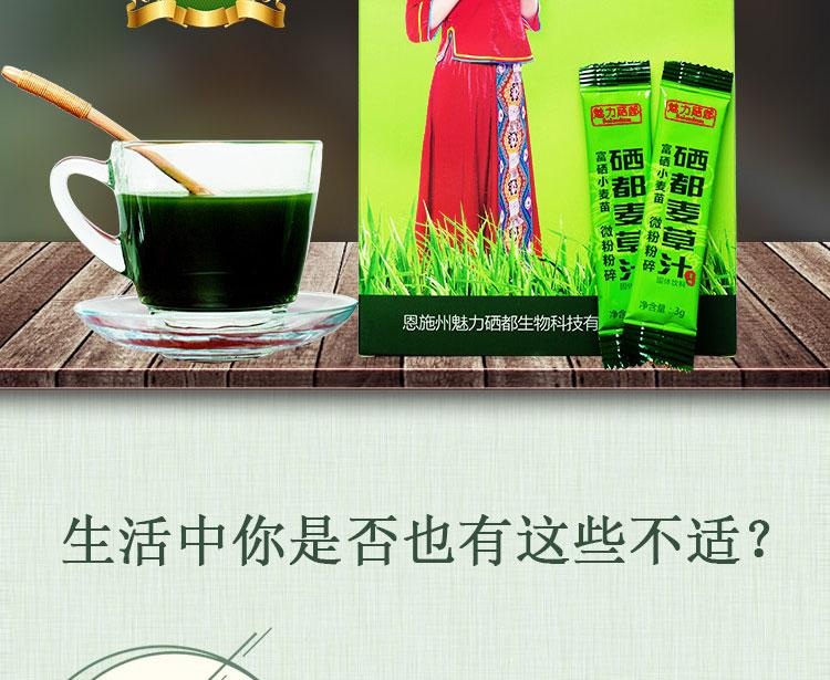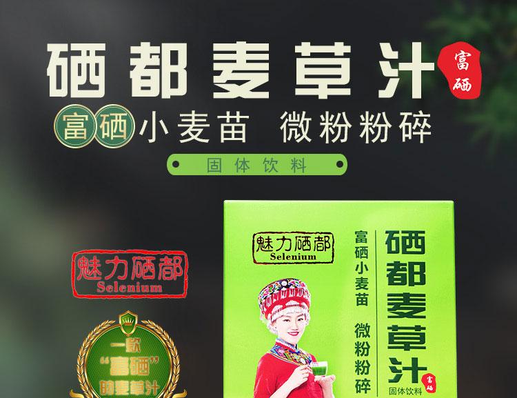 产品名称 魅力硒都固体饮料 配料 富硒小麦草、二氧化硅 规格 90克(3克/袋x30袋)