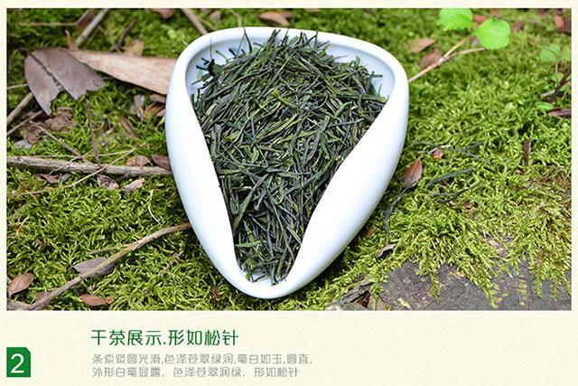 茶叶特点:条索紧细、圆直、微露白毫,色泽苍翠润绿,形如松针,茶汤清澈明亮、香气清鲜、滋味醇爽