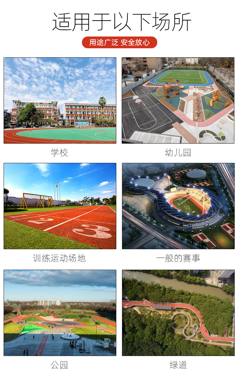 或PU颗粒、颜料、助剂、填料组成。塑胶跑道具有平整度好、抗压强度高、硬度弹性适当、物