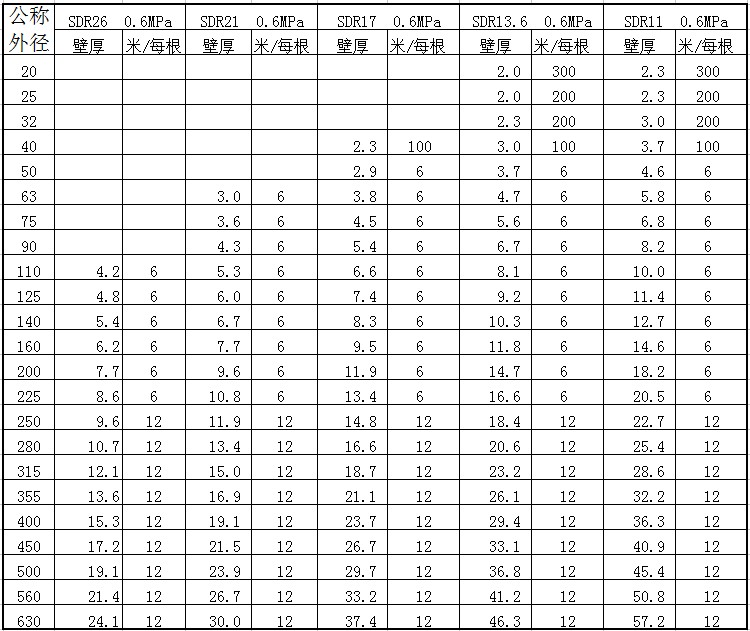 PE给水管材对应型号表