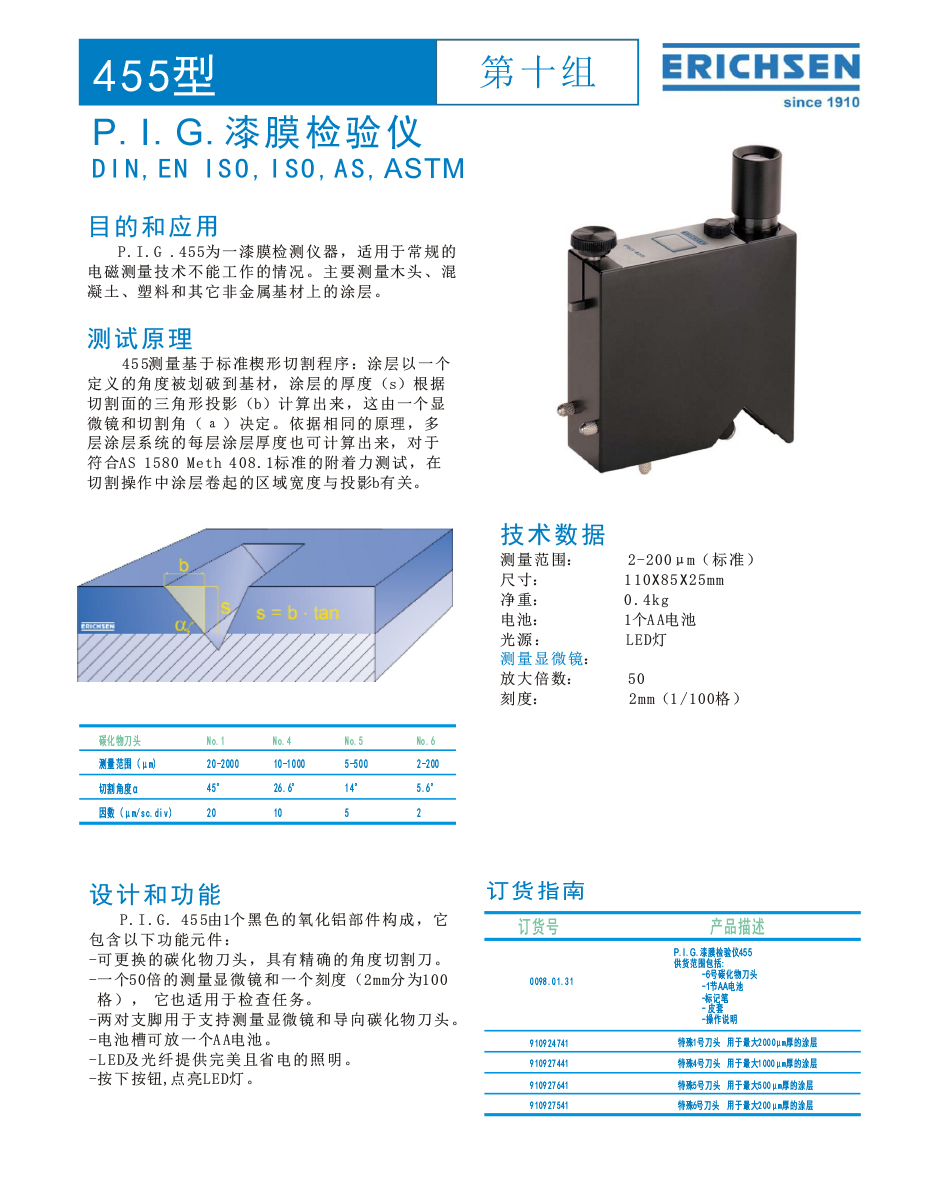 德国仪力信Erichsen PIG455破坏式涂镀层测厚仪订货信息