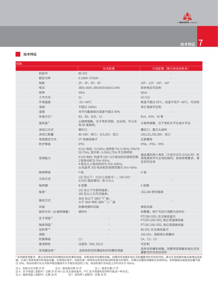 特色服务 | 如有特殊要求,如电压、频率、防护等级、旋转方向、安装型式、双轴伸、噪声、振动限值及防爆标志、接线盒进线方式等必须签订技术协议后,方可制造。 | ||