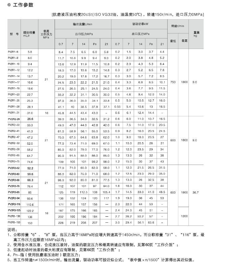 5、当工作转速n≠1500r/min时,输出流量,驱动功率可按近似公式:“ 表中值x n/1500"计算得出其近似值。