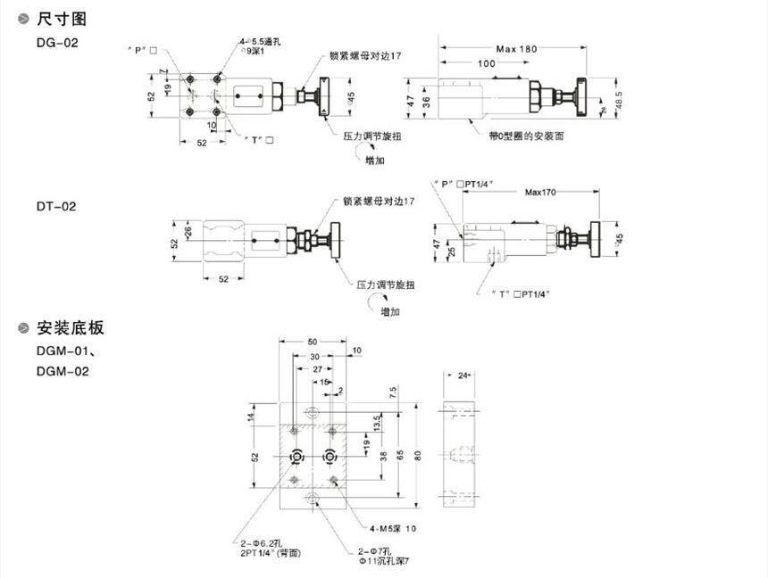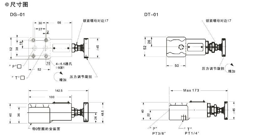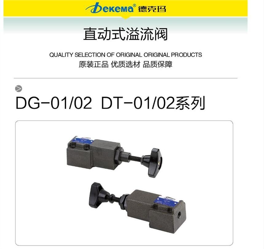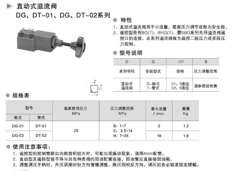 直动式溢流阀分为板式和管式,其中板式的型号有DG-01和DG-02,管式直动溢流阀的型号是DT-01和DT-02