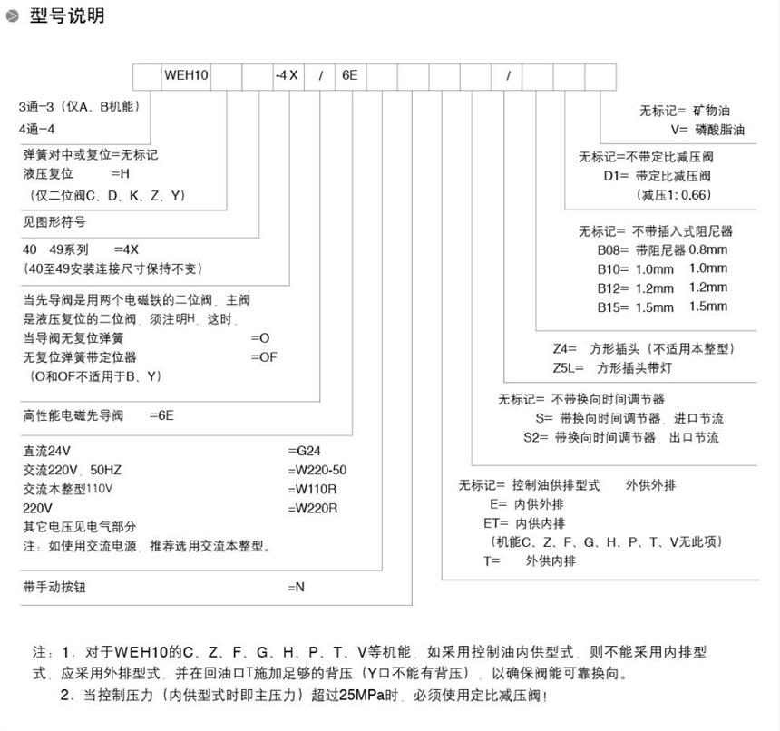 注: 1.对于WEH16 32的C. Z. F. G. H. P. T. V等机能.如采用控制油内供型式.则尽可能采用外排型式.并在回油口T施加足够的背压(Y口不能有背压).以确保阀能可靠换向。加预压阀能解决内供型式阀的换向.但阀的通流能力会下降很多。2.当控制压力(内供型式时即主压力)超过25MPa时 .必须使用定比减压阀!