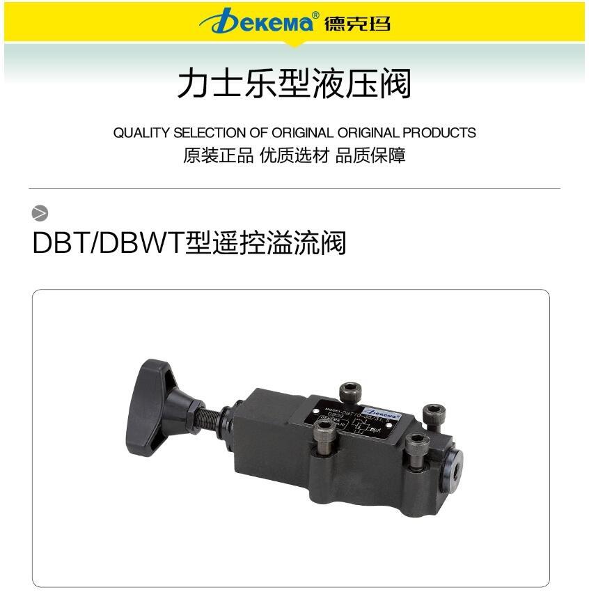 DBWT型电磁遥控阀:此阀由阀体(1)、阀芯(2)、阀座(3)、弹簧(4)、先导阀(5)及调节装置(6)组成。工作原理与DBT型基本相同,只是压力的卸荷可以通过先导阀(5)的动作实现的。DBT/DBWT型遥控结构简单,压力控制方便,温度性好,无啸叫。使用于塑机、机床、冶金、矿山、工程等各领域的液压系统自动化控制中。