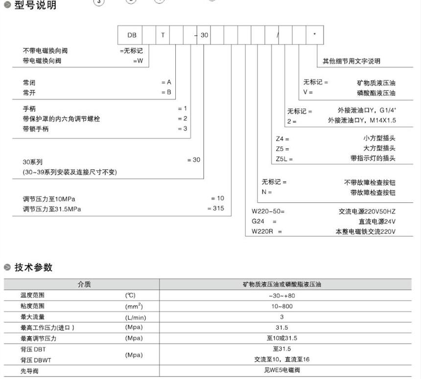 DBT遥控溢流阀:分常闭A和常开B,数字1表示带手柄,数字2表示带保护罩的内六角调节螺栓,数字3表示带锁手柄,安装及连接尺寸30系列,调节压力至10MPA和31.5MPA,电源有交流W220V和直流G24V,带故障检查按钮N表示,不带按钮无标记,Z4表示小方形插头,Z5表示大方形插头,Z5L表示带指示灯插头,矿物质液压油无标记,磷脂酸液压油V表示,其他技术要求请联系本公司技术部