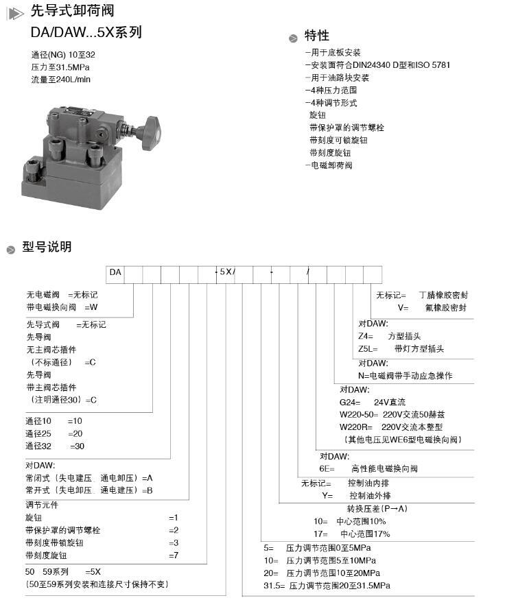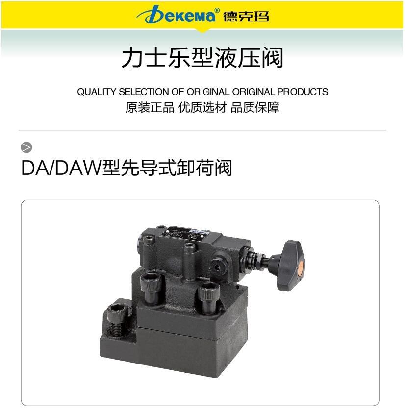 DAW型卸荷阀:该阀功能基本与DA型阀相同。只是在先导阀上装有电磁阀(15).可 在先导阀调定的切换压力任意完成从P至A或P至T。