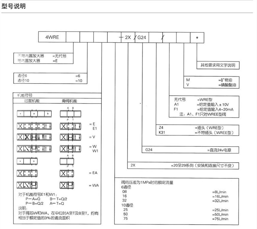 注意: 1.对于4WRE().. -2X.. .型阀,必须避免回油管路中的由全部排空,必要时在回路中安装背压阀(背压约为0.2MPa)。