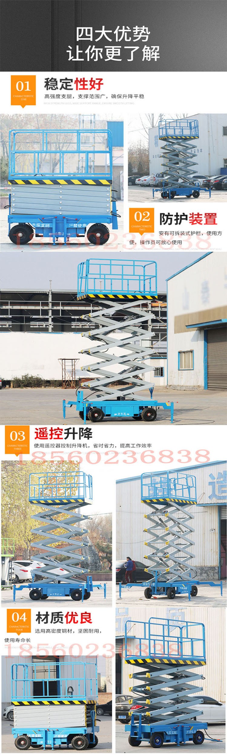 移动剪叉升降机主要是四轮移动行走,一般由底座、剪叉结构和工作台三部分组成。底座采用相应强度钢板焊接而成;剪叉结构采用山钢集团,上海宝钢集团的高强度锰钢矩管制作,强度高、外形美观;工作台,结构坚固,台面宽大,承载能力高,升降平稳,维护保养简单方便,可多人同时工作,使高空作业更安全、效率更高。并设有安全护栏,操作安全可靠。可根据客户要求进行尺寸的定做,台面延伸等。