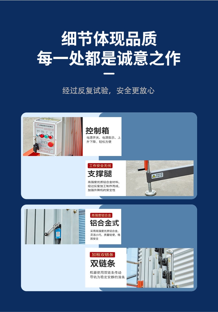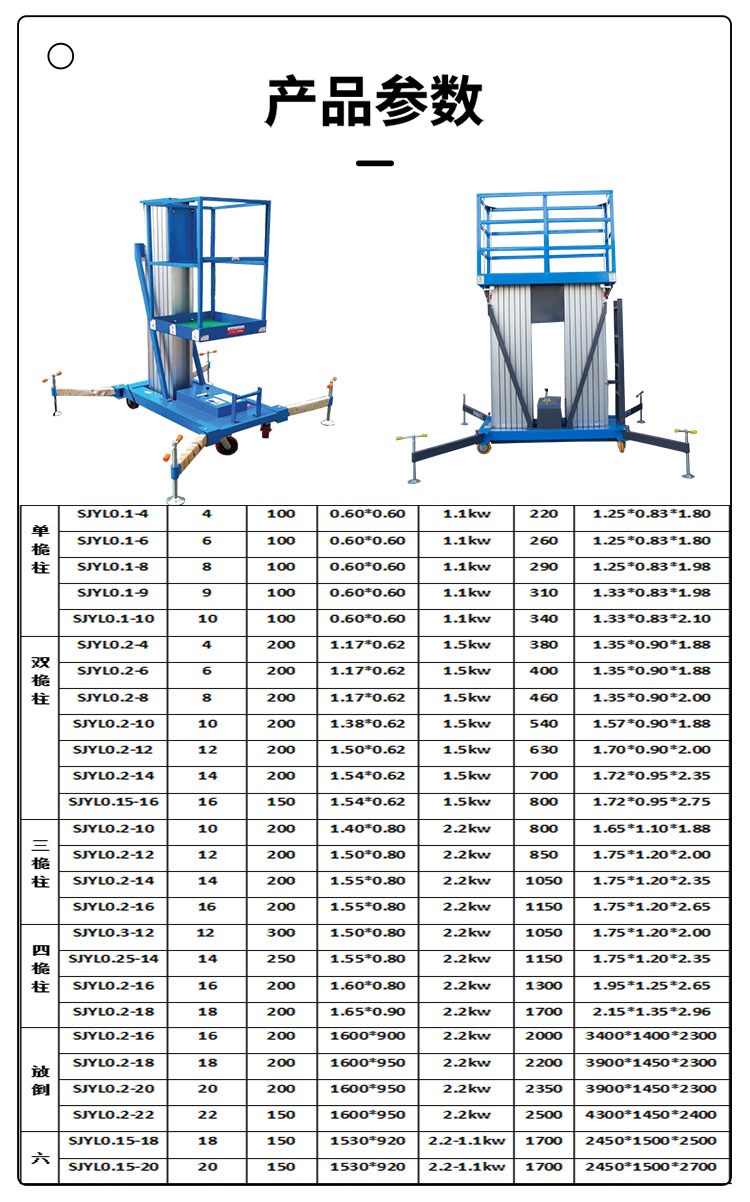 双桅柱铝合金升降机系列产品运转灵活,载重量大,平台面积大,一人既可以推动,推行方便,可以进入一般的门厅,小型电梯等,能在极小的空间内发挥较高的举升作业能力。该升降机广泛应用于厂房、大厦、商场、车站、机场、体育场等,用于电力线路、照明电器、高架管道等安装维护、高空清洁等单人或双人高空作业的工作。