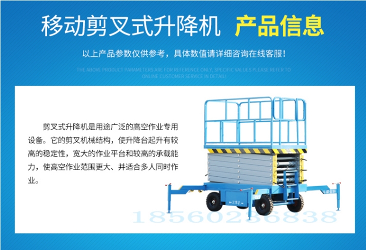 移动剪叉升降台其原理就是液压升降结构跟电子集成控制器结合来完成平台的起升及其降落。在方便升降的同时能及时调整高度,考虑到客户使用的安全问题产品一般的设有防滑绝缘塑质水波刻纹板,更换方便,整体美观大方。不用人工手降梯子省力省时间,真正实现了安全快捷,方便易操作,高工作效率。