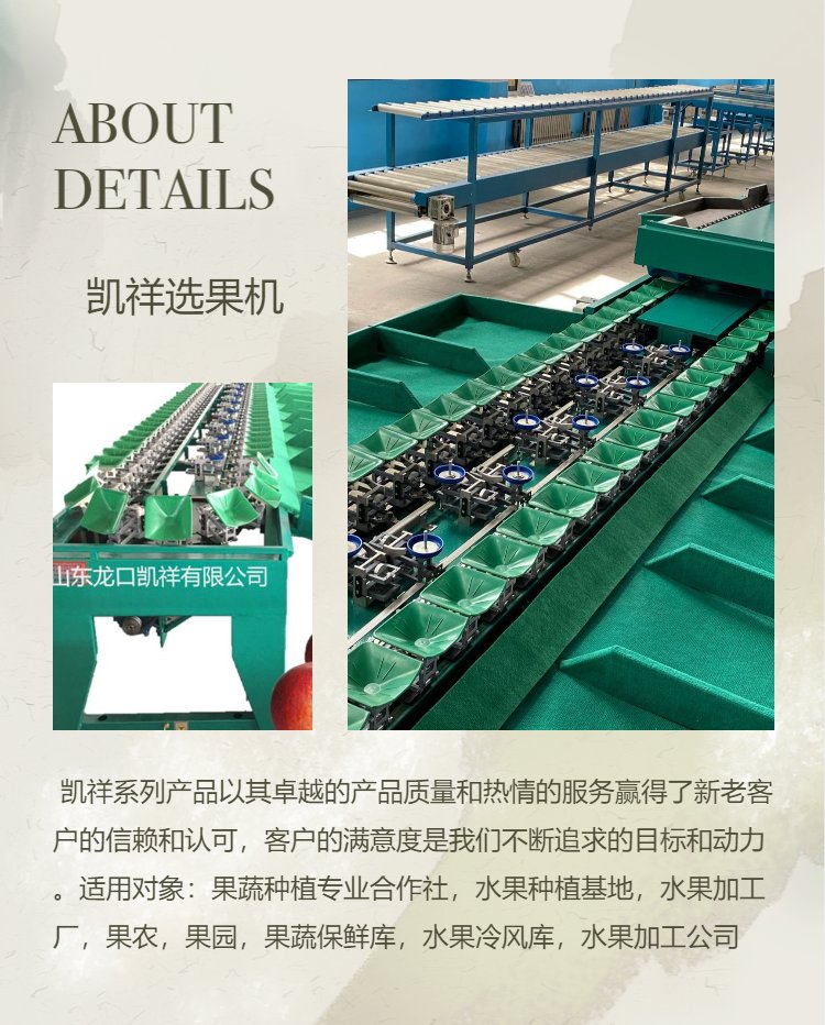 ??山东龙口凯祥有限公司生产的映霜红晚桃分选机,采用天平与杠杆原理,利用盛料器重量与砝码器所设定秤量,以游动时的移位与测量达到选择重量的分等分级。在全自动的传送中,快速正确的对各种需要分级的果蔬称重分选,例如梨、苹果、芒果、桃、柑橘、沙糖桔、桃、西红柿、马铃薯、地瓜、李子、柿子、洋葱等,产生精确的分级。大厂家,产品质量可靠,售后服务周到。
