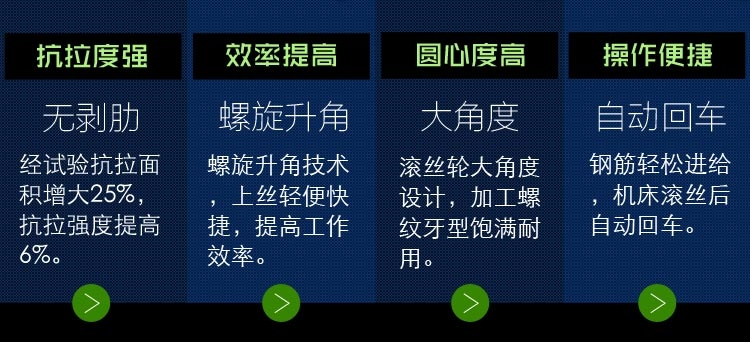 中动DZG-40型钢筋滚轧直螺纹机床主要用于建筑工程带肋钢筋滚轧直螺纹丝头加工,是实现钢筋连接的关键设备,可加工φ16—φ40mm的HRB335、HRB400、HRB500及HRB600级带肋钢筋。 DZG-40型钢筋滚轧直螺纹机床特点: