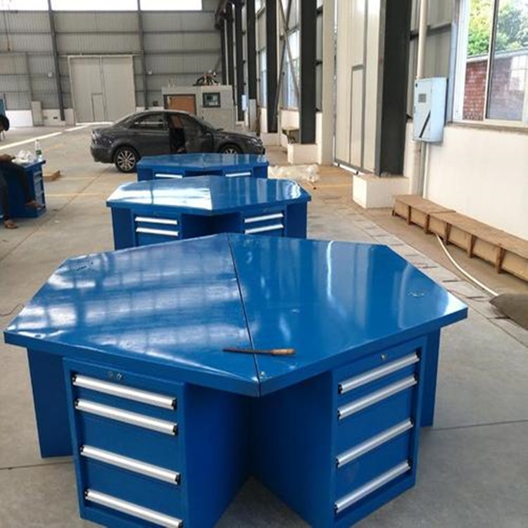 工作台颜色:工作台根据国际标准色可分为6种:浅蓝色(RAL5015), 电脑灰(RAL7035), 机床绿(RAL6011),深蓝色(RAL5005), 苹果绿(RM071-1EK), 红色 (RAL3027). 除这几种标准颜色为还可根据客户要求配色。
