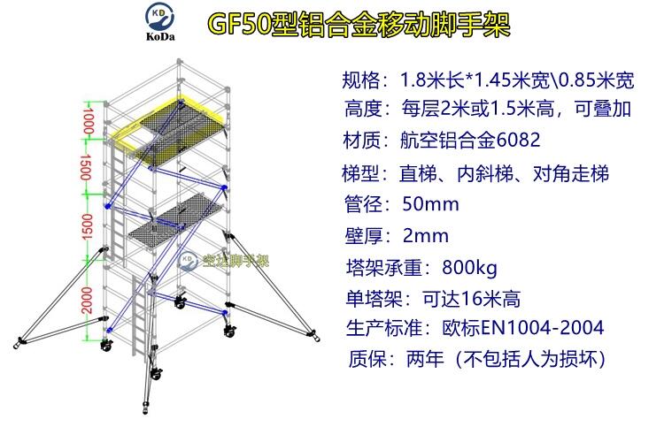 平台每张踏板的可承载力为272kg,顶层的工作平台可承载200Kg/㎡,塔架的可承载量(包括自身重量)是1000kg。2m铝合金脚手架移动平台所需零部件明细:脚轮4个,水平拉管6个,四横铝架1个,四横铝架内梯1个,铝围栏2个,开窗式踏板1个,木踢脚板1个、斜拉管2个,D型扣4个。