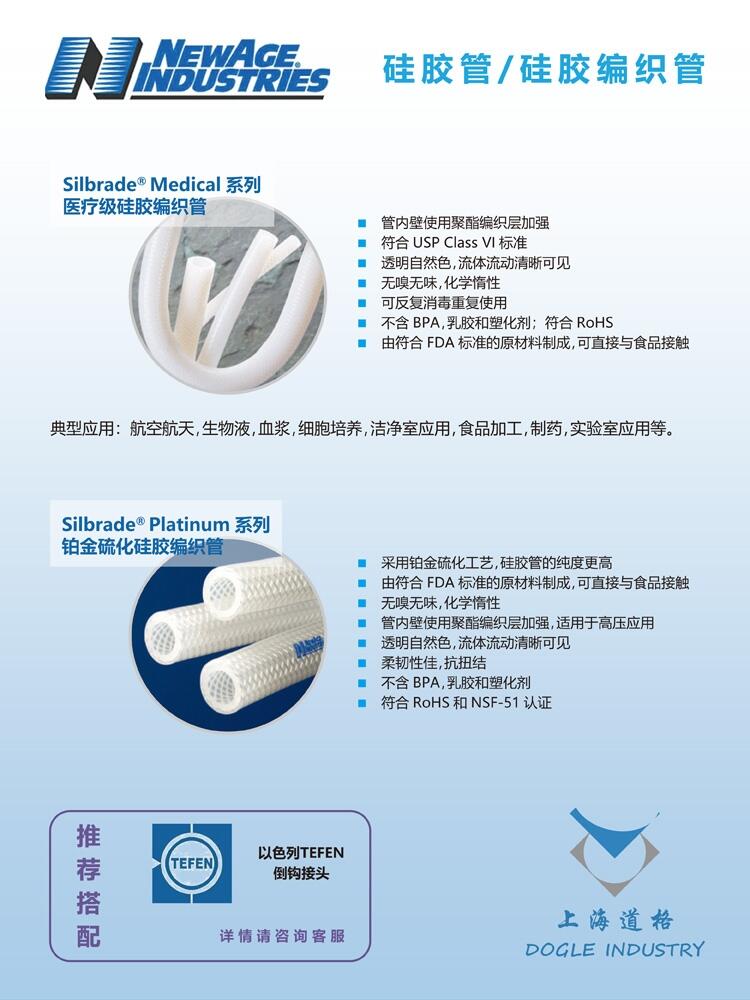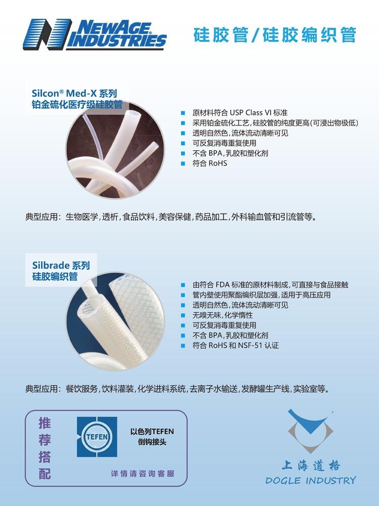美国NewAge专业制造各种材质的食品级/工业级/医疗级塑料软管、半硬管和硬管,包括PVC,硅橡胶,氟橡胶,特氟龙,尼龙,PP,PE和PU等。产品已通过3A,NSF, USP Class VI,FDA等认证。