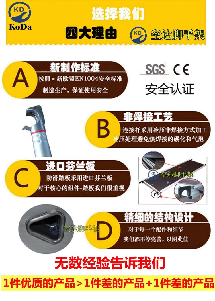 移动铝合金脚手架的前景广阔,许多劣质铝合金脚手架产品占据了一部分市场,在购买移动脚手架的同时,应该注意是否符合安全标准,好的脚手架应当符按照欧盟EN1004标准设计制造,获得TUV安全认证,除此之外,还应在正规渠道购进,选择有实力、有强大的售后服务能力的厂家或销售公司。