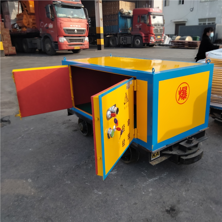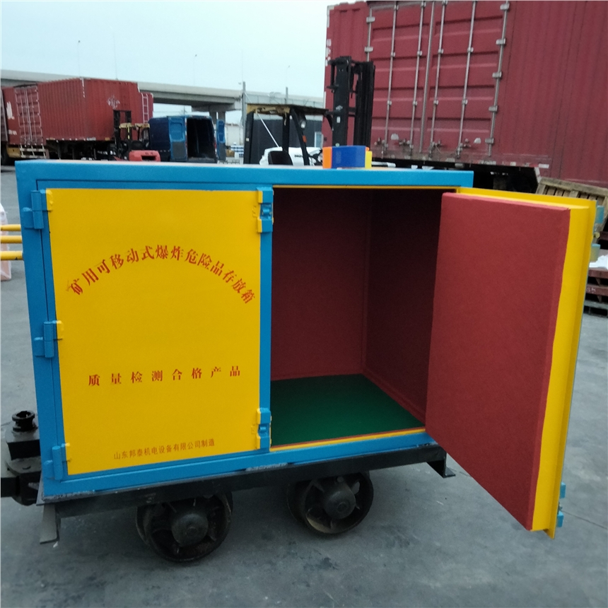 爆破材料的运输需要由爆破工或者爆破工监护下运送,并存放在抗撞,防震,耐压和防静电的容器内,这款适合井下B破器材运输车是由上下两个部分组成,上部分为存储功能的防爆柜,柜体使用不低于6mm厚的钢板制作而成,内部加护一层10mm厚绝缘木板,最里层是防静电阻燃毡,存放柜结构合理,密封性较好,有效防潮防静电,门上装配有两把锁具和一个机械式密码锁,钥匙需2人分开保管,存放安全,防盗性能突出,下部分为承载运输柜的矿车部分,按照矿井常用轨距,可分为600,762,900轨距,多辆车之间使用插销和三环链连接,比普通矿车运输危险品更有安全保障。