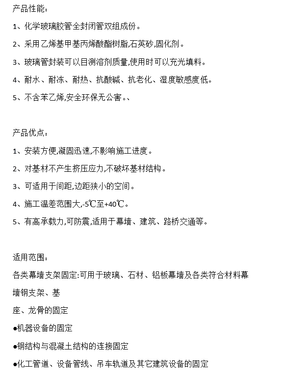 1.化学药管组成:乙烯基树脂,石英颗粒,固化剂。