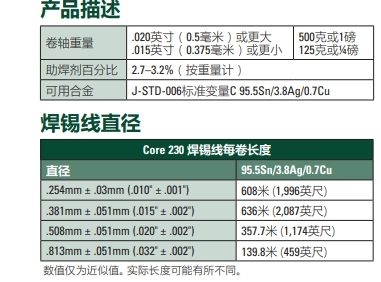 ore 230含芯焊锡线以免洗助焊剂为芯,与铟泰公司的NC-SMQ230无铅焊 锡膏完全兼容。它含有热稳定的松香,在无铅组装中的各种金属表面上展 现出的润湿性和焊料分布。