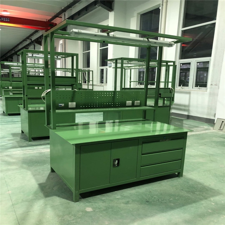 工作台材质:材质采用优质冷扎钢板,通过的自动化静电喷涂工艺进行表面处理;工作台根据用户要求,工作台桌面可选择特殊成型高分子纤维板等不同材质、不同厚度的基材。基本桌面可选择:高分子复合桌面、防火板桌面、不锈钢包面、铁板合成面、榉木桌面、橡木层压板左面、防静电桌面、电木板帖面等; 工作台上可配照明架、吊架、搁板、方孔挂板、百叶挂板、动力电源插座、电器盒、零件盒挂条等,满足用户不同的需求。