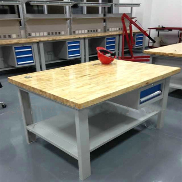 工作台台面为高密度层压板和2mm高分子材料组成,使台面具有耐油耐磨耐腐蚀,抗冲击力强的特点;台面表面平整,稳定性强,负荷承受力度高;