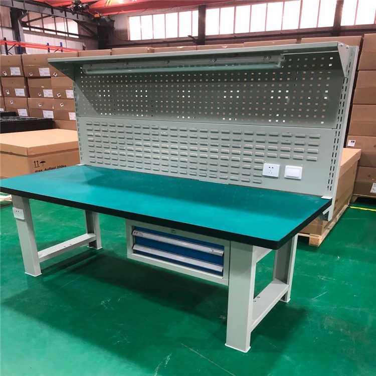 特点:台面采用高密度复合板,表面平铺6~~10mm铁板,采用焊接、螺栓等机械连接钢板。强度高、抗冲击性强,耐磨耐用,使用寿命长,可装配台钳;