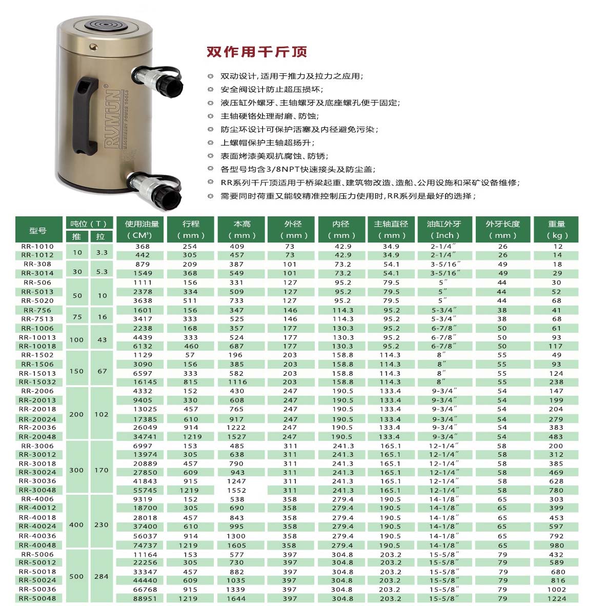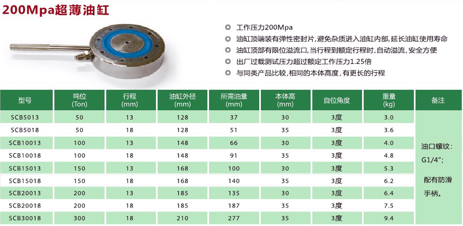 单作用大吨位油缸是特别为举升和维修而设计,可选配倾斜底座以减轻侧压的损 坏风险,程限制安全阀保证了活塞只能伸展到其额定行程长度。