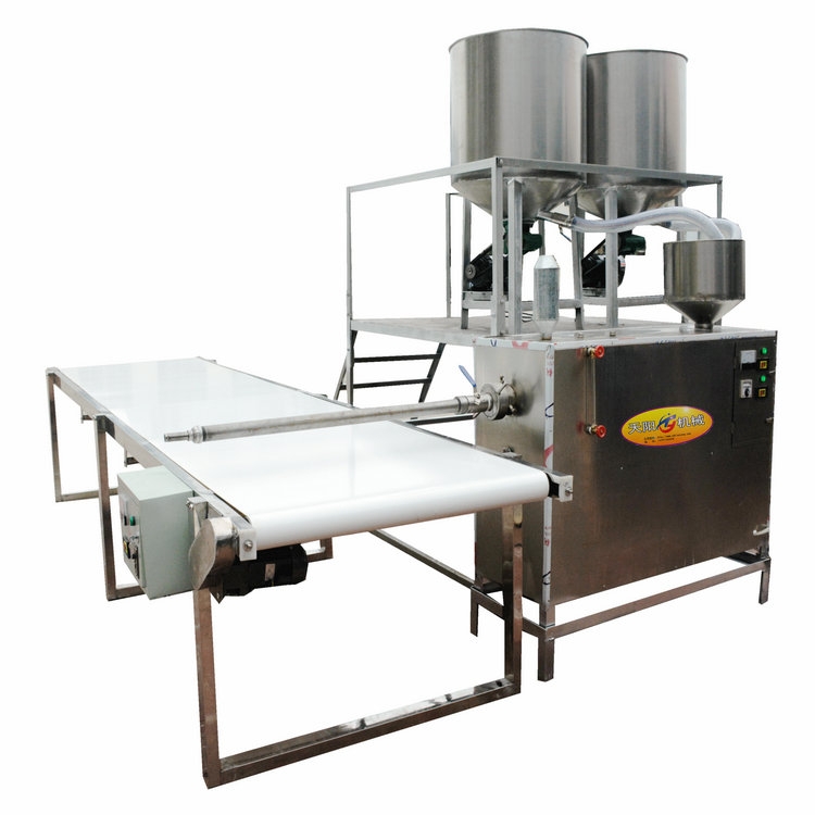 商用工厂型红薯粉条机,全自动粉条生产线由循环搅浆系统、自熟漏粉系统、调速接条系统和动力系统组成,漏粉系统装有电热温控装置,可随时控制粉浆的熟化温度,使粉浆能再一定的温度下熟化糊化,保证了产品的一致性, 粉条的成品合格率达到95%以上,接条传送系统装有变频调速装置,可以根据主机漏粉速度调整传送带,使之与主机同步,以满足生产工艺的需要。
