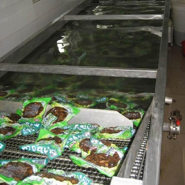 在食品、饮料、制药等行业中,要求对一些包装完毕的产品进行水浴灭菌。被包装好的产品在可调速的不锈钢网带上,在传送带的作用下按序进人灭菌箱体内,经由“高温水为介质”杀菌后,再由另一条传送带带人冷却箱体内均匀冷却,从而达到产品杀菌要求,后面接着进入连续风干线可直接装箱。本机连续运转,已灭菌的包装产品被送入下一生产工序。