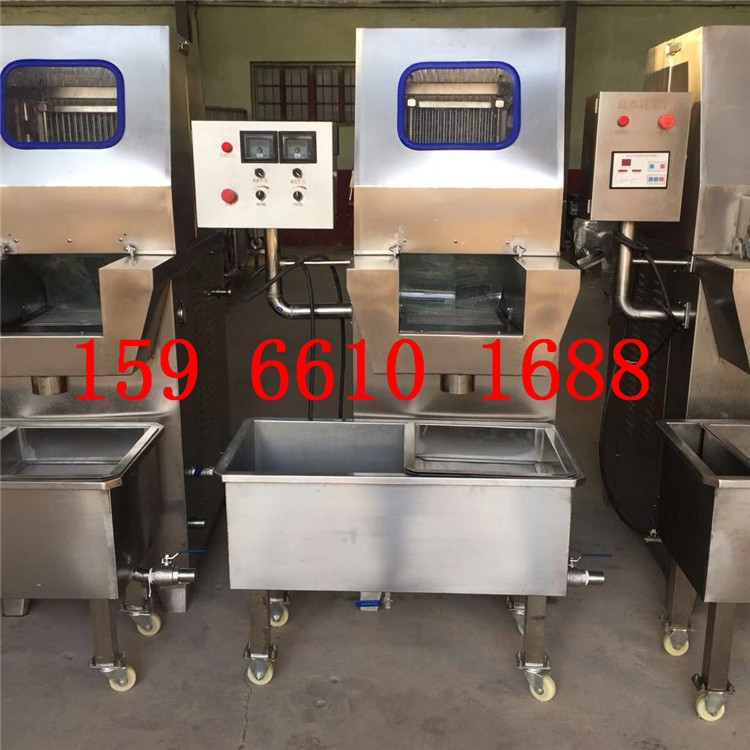 盐水注射机可将盐水及辅料配制的腌制液注入肉块中,再通过真空滚揉使料液充分腌渍,渗透,可疏松肌肉组织结构,有利于肌球蛋白溶出,并且由于添加剂对原料肉离子强度的增强作用和蛋白等特点的调整作用,注入配制的水溶液能使肉质嫩化、松软,从而提高了肉制品的出品率和改善肉制品的嫩度和口感。