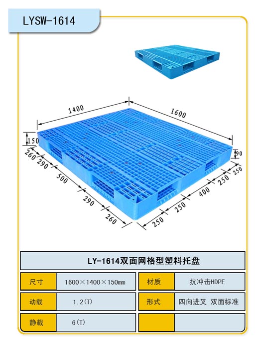 双面形塑料托盘,双面网格1614150塑料托盘,力扬塑料托盘制造厂专业生产各种规格型号托盘,全部采用低压高密度聚苯乙烯一次性注塑成型