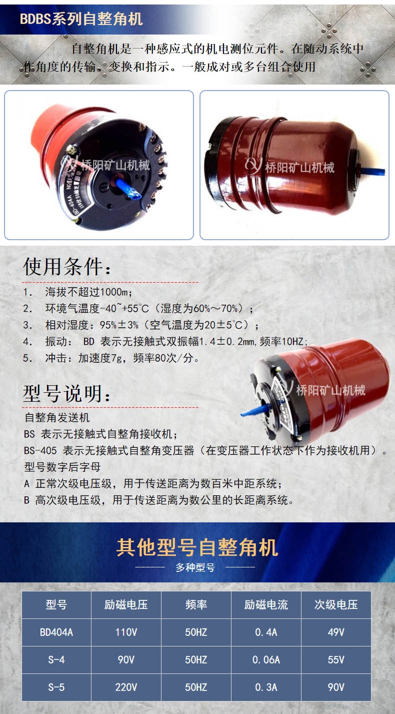 BDBS系列型自整角机为封闭式结构,当它用作接收机时,有一个特殊的阻尼装置,即装在轴上的机械阻尼器。该型无接触式自整角机与接触式自整角机相比,其特点是无滑动接触,在缺乏维护的环境中和受到颠簸、振动的系统中使用。