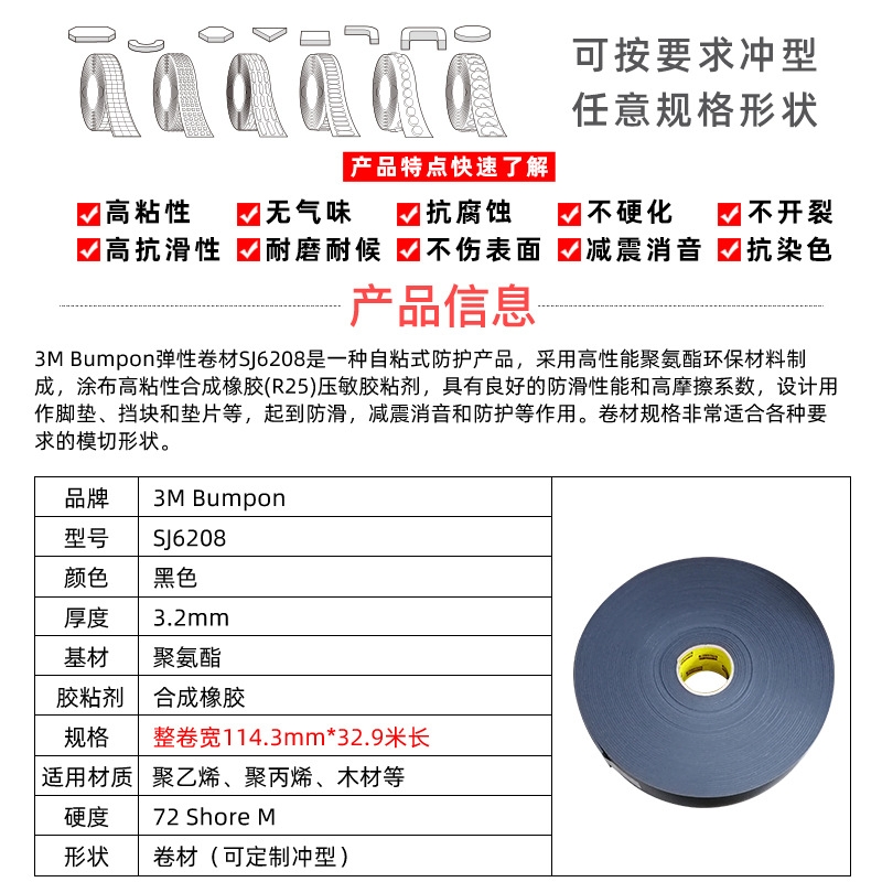 美国3M SJ6208 SJ6016 SJ6032自粘型防滑防震脚垫垫片 卷材可定制