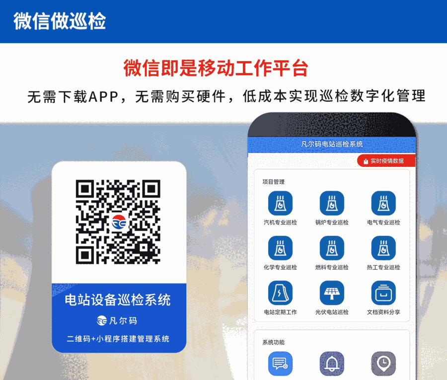 电力设备巡检二维码管理系统,能够在很大程度上规范巡检流程,落实巡检工作,做到有据可依。提高管理体系,最DA程度的减少安全隐患。通过凡尔码平台为电厂每台设备生成专属二维码,并通过微信扫一扫就可查看电力设备的各项参数指标、使用说明书、检修记录、定期工作等信息。确保每台设备的信息准确和完善。