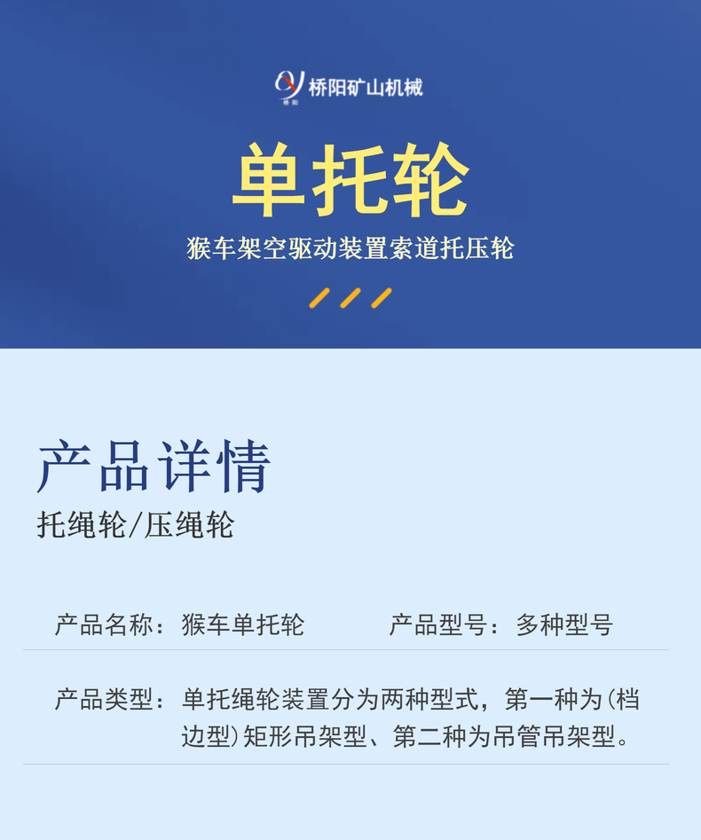 单托轮是架空乘人装置上使用较多的配件之一,按规格可分为180、200、210、240、260、280(直径毫米),按用途可分为适用于固定抱索器、活动式抱索器、卡钳式抱索器、可摘挂式抱索器三种,选用规格基本相同,区别在于长轴、短轴,轴粗为25还是30,配套的轮衬变化,提供多种矿用配件,提供照片或产品样品即可供货。