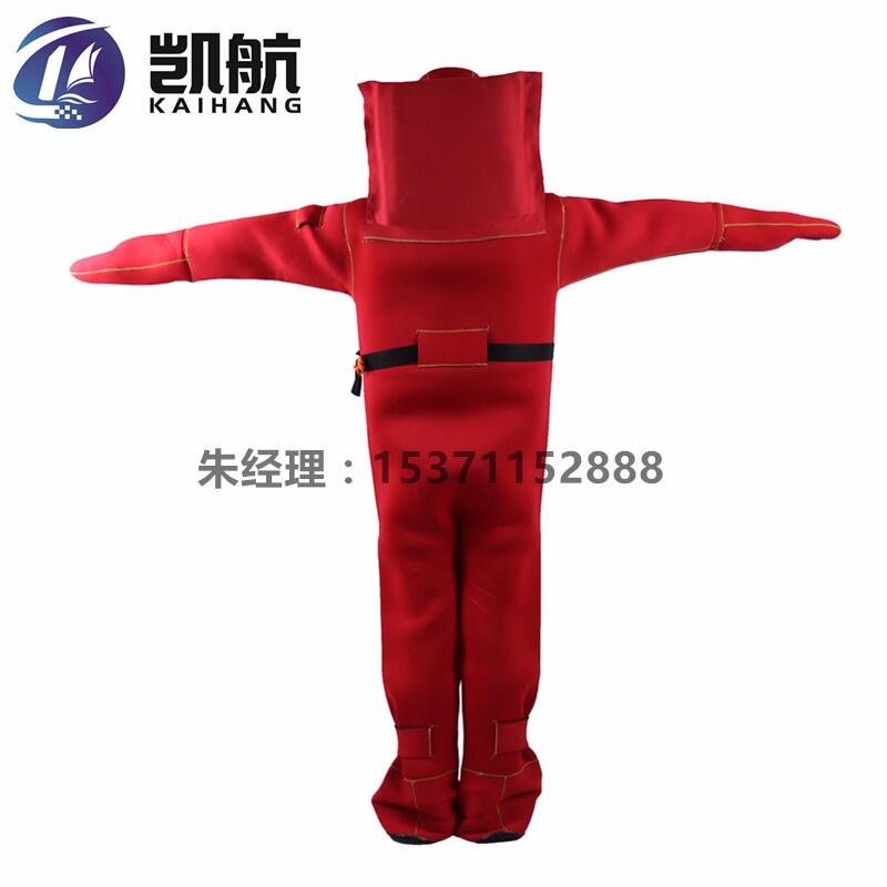 帽(可带有面罩)、衣、裤、靴、手套等水密连为一体(手套亦可不连接)的具有规定保温性能及浮力性能的救生服装。