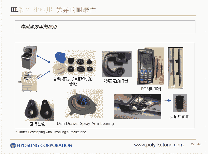 性能:耐化学,阻隔性能强,降噪耐磨(POM的14倍),自带润滑,回弹性好,高冲击(尼龙,PBT的2.3倍),耐水解,无析出,通过德国NSF饮水认证;