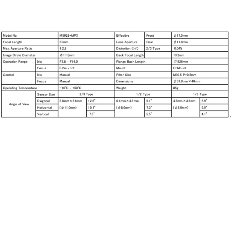 M5028-MPX 日本Computar 1600万像素2/3英寸50mm定焦光圈范围F2.8 ‐ F16.0低畸变C接口工业镜头 详细技术参数: