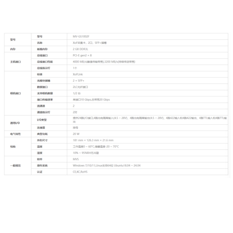 MV-GS1002F 海康机器人XoF光口采集卡,2口,SFP+插槽 详细技术参数: